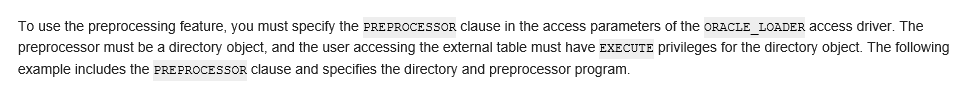 意思是:如果想用预处理特性,必须把preprocessor子句放在access parameters里面,并且指定oracle_loader引擎。