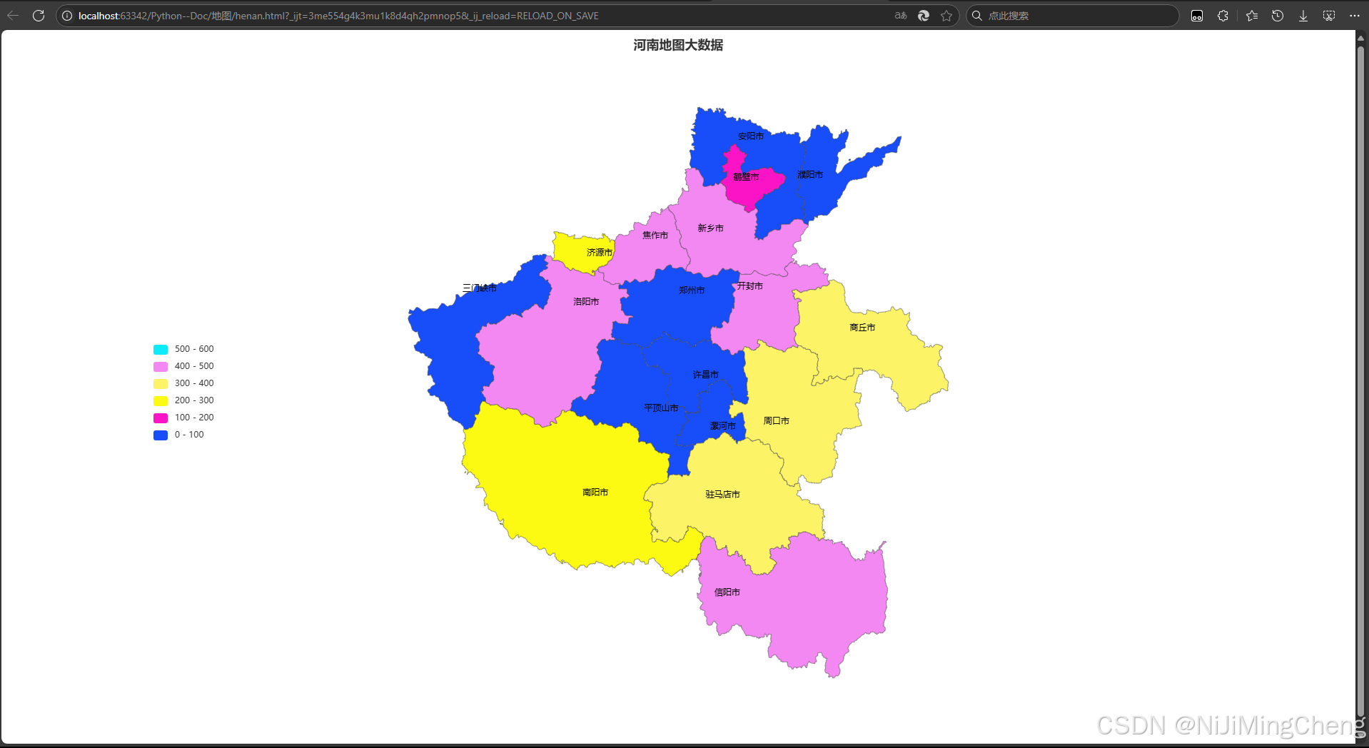 #0bebf9,#f488f2,#fcf367,#fcf912,#fa14c6,#184dfa等),实现了根据数据值的范围在地图上以不同颜色显示各个城市区域的效果。例如,数据值在某个区间内的城市可能显示为蓝色,而在另一个区间内的城市则可能显示为红色等,这样一来,用户可以通过颜色直观地看出不同城市的数据差异和分布情况。 - 系列数据(series):在这个数组中,我们配置了图表的系列数据。其中,系列名称为 “数据”,类型为 “map”,地图类型明确设置为 “河南”(当然,如果需要展示中国全图可以将