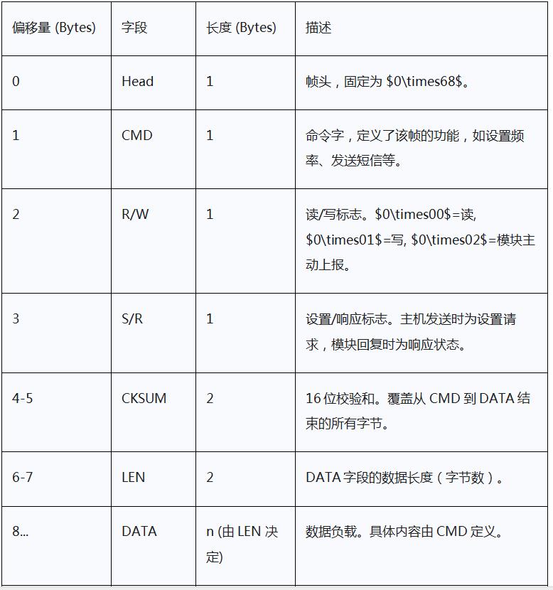 与模块进行有效通信的关键在于正确实现其串行控制协议。该协议采用二进制帧格式,所有参数配置和状态查询都通过收发特定的数据帧来完成。