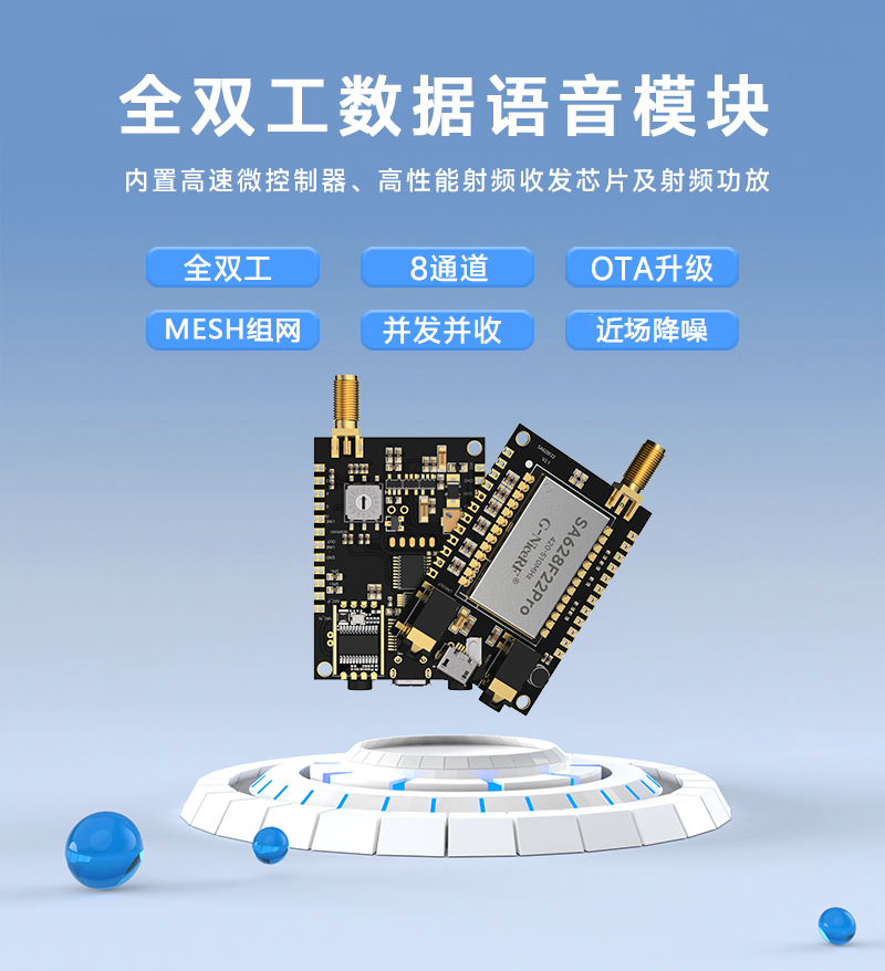 以SA628F22Pro 系列全双工降噪通信模块举例说明,SA628F22Pro 在底层架构上采用了 全双工语音处理与MESH自组网机制,能够在嘈杂环境下保持多人同时交互。