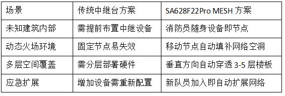 MESH技术在消防对讲应用中核心优势所在不同于固定场所的通信网络,无需无需预先部署,每个消防员佩戴的SA628F22Pro设备本身就是网络节点,当队伍进入火场时,设备间会自动建立通信链路。加入的消防员设备会自动并入现有网络。测试数据显示,20个移动节点可在3秒内完成组网,覆盖纵深达800米的线性空间。