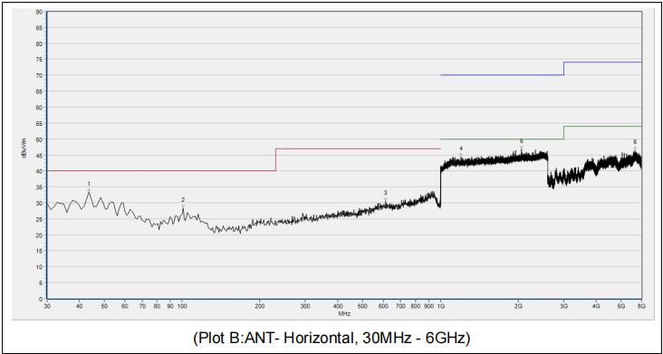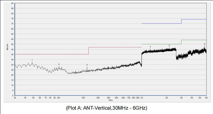 杂散域无用发射: 报告对模块在三种不同天线(镀金弹簧天线、铜弹簧天线、导线天线)配置下的杂散发射进行了全面测试,频率范围覆盖25 MHz至6 GHz。所有测试结果均显示,杂散发射水平远低于ETSI EN 300 220-2标准规定的限值。例如,在使用天线2(铜弹簧天线)时,在3034.043 MHz处测得的峰值发射为-32.59 dBm,显著低于-30 dBm的限值,证明了其优异的频谱纯净度。