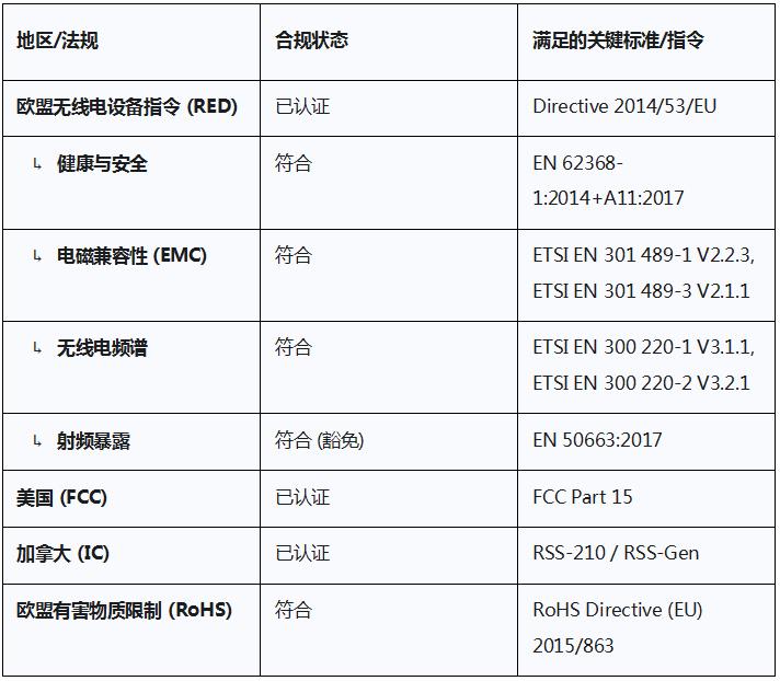 第2条 (无线电频谱的有效利用):模块符合ETSI EN 300 220-1和ETSI EN 300 220-2标准。上一章节中详述的射频性能测试报告为此项合规提供了实证数据。