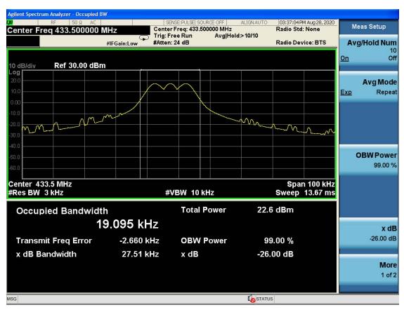 (频谱分析仪截图显示占用带宽为19.095 kHz)