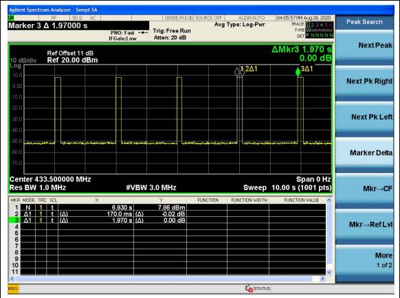 占空比 (Duty Cycle): 测试报告同样验证了模块的占空比特性。在1小时的观测周期内,模块的累计传输时间符合规定,测得的占空比为 8.63%,低于法规要求的10%限值,这对于在共享频段中运行的设备至关重要。