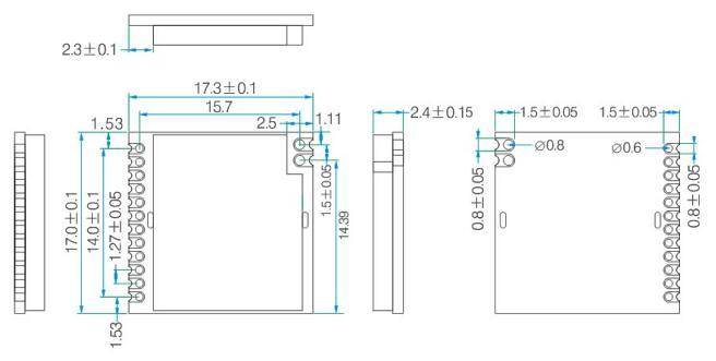 RF4463PRO模块采用14引脚的半孔邮票边封装,其引脚定义如下: