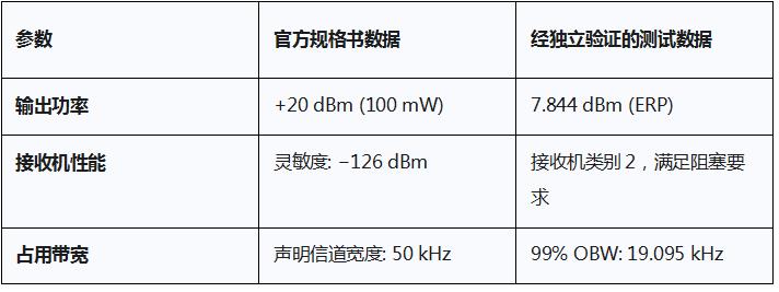 本部分将从官方规格书的理论值转向经过第三方实验室验证的实际性能数据。所有分析均基于独立的测试报告,为模块的RF能力提供客观的验证。