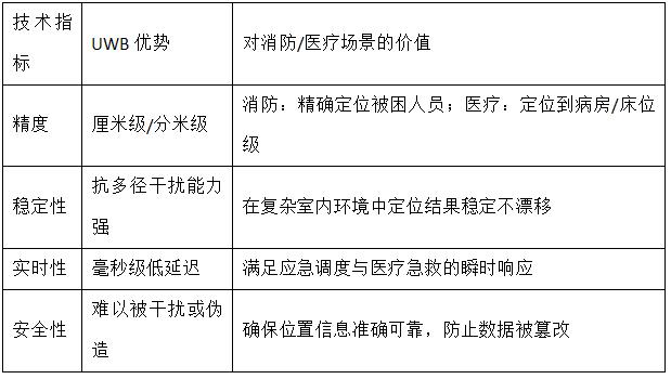 相比之下,UWB凭借10–30厘米级定位精度、毫秒级延迟、强抗遮挡性能,在消防救援、医疗管理、工业监控等场景展现出显著优势。