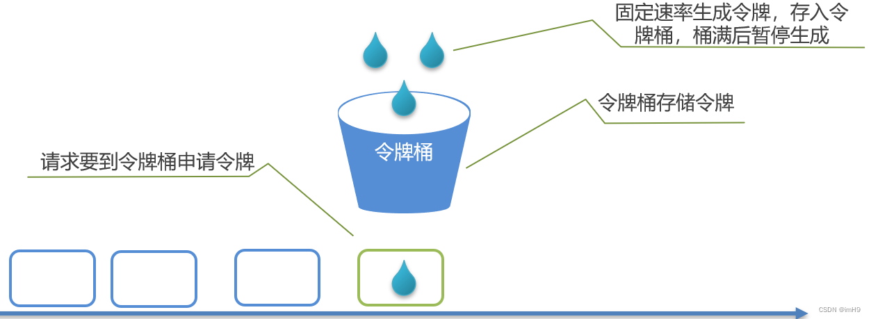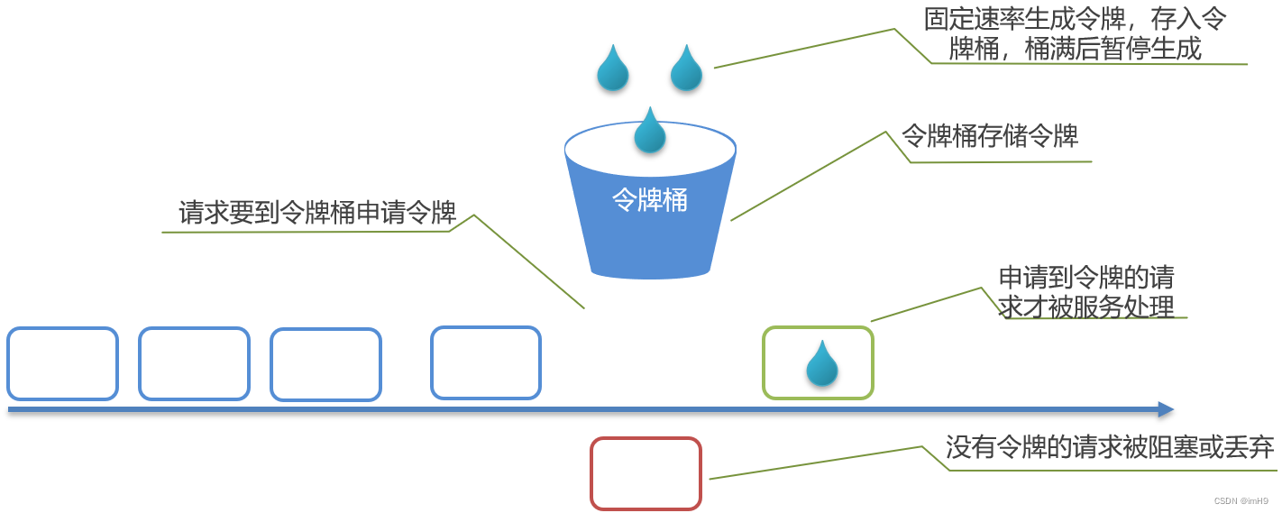 1. 请求速度大于令牌的生成速度:那么令牌桶中的令牌会被取完,后续再进来的请求,由于拿不到令牌,会被限流