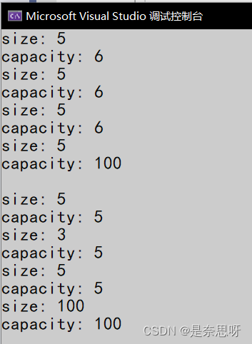 关于resize与reserve,与string用法也一致,我们采用三个范围的数据测试着两个接口对size与capacity的影响;