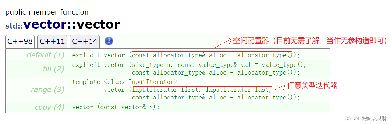 首先我们需要看的便是构造函数了,相对于string,vector的构造函数就比较精简了;有如下四个;