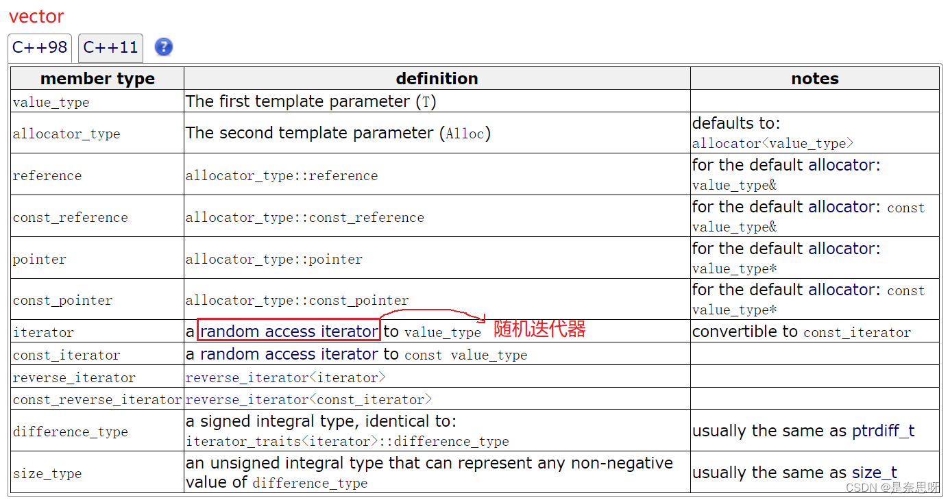 随机迭代器就像我们vector的迭代器,可以指定访问某个数据,可通过加减O(1)的时间内访问某个数据;