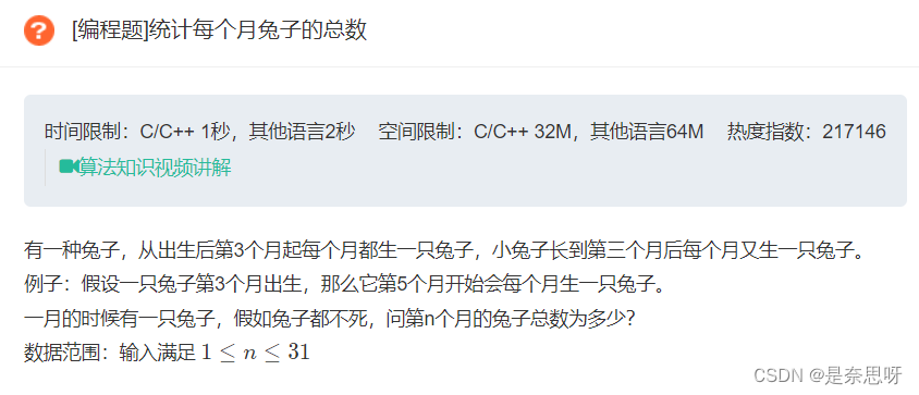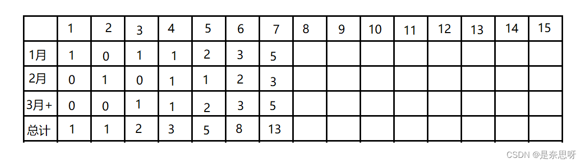 思路:仔细阅读题目,我们不难发现,题目就是让我们求斐波那契数列的第n项;下图画出1到7月一月、二月、三月大的兔子的个数分别是多少;发现就是我们的斐波那契数列;