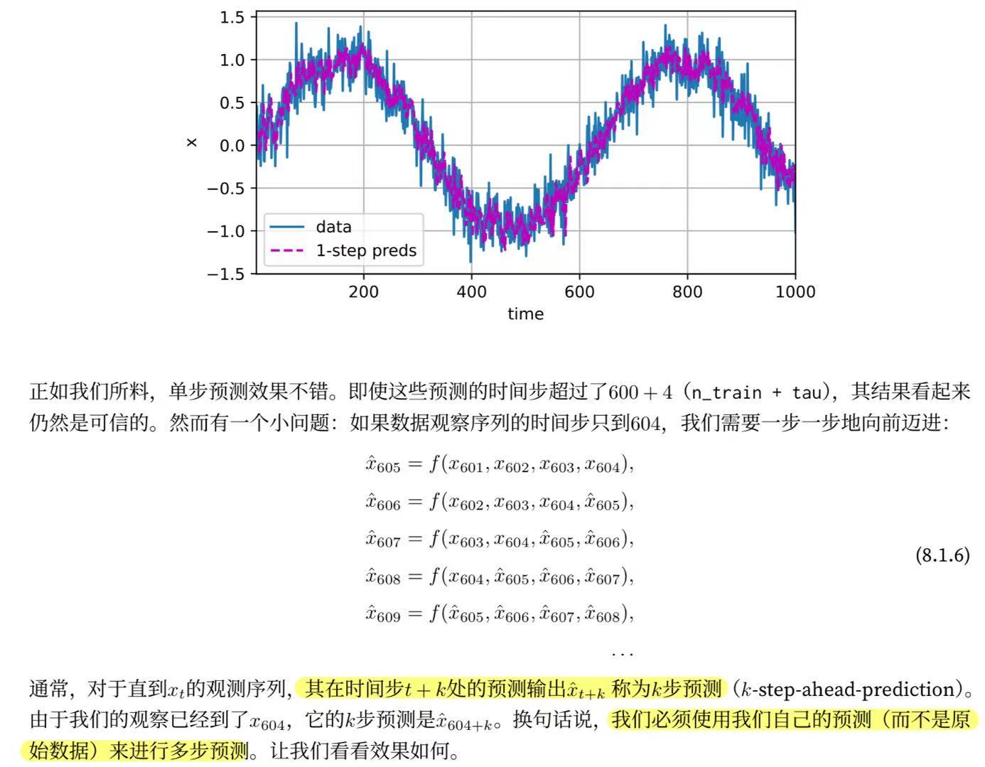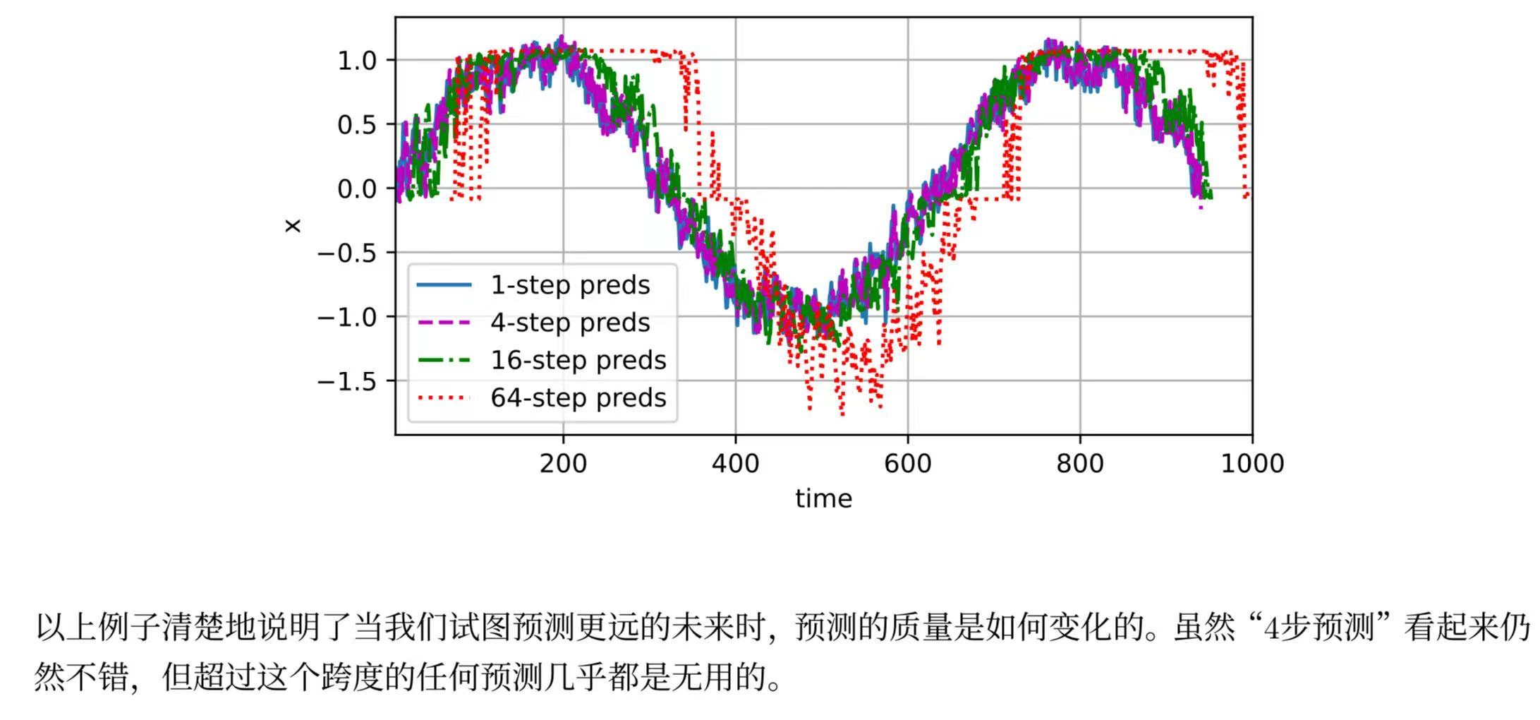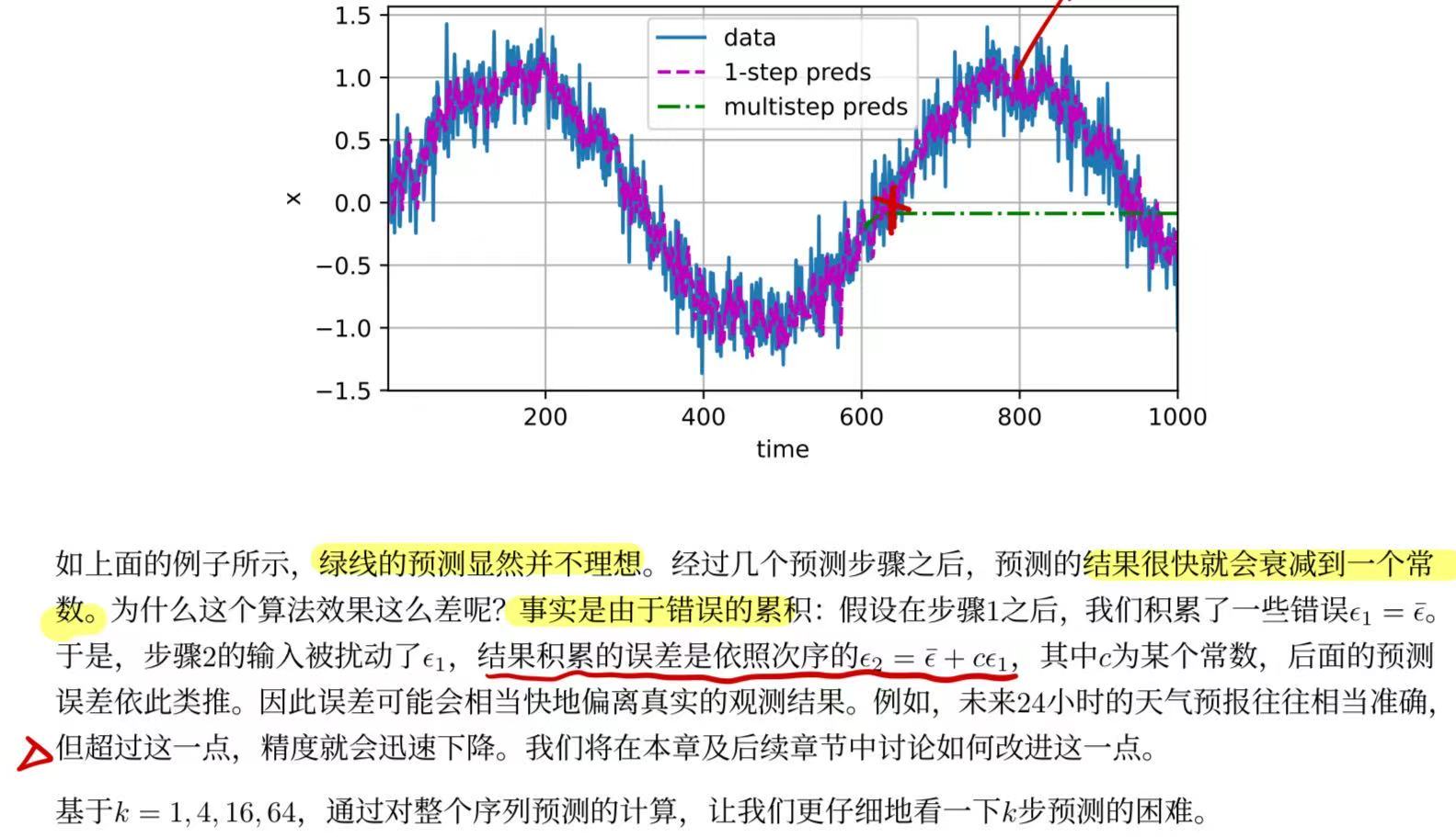 对于直到时间步t的观测序列,其在时间步t+k的预测输出是“步预测”。随着我们对预测时间值的增加,会造成误差的快速累积和预测质量的极速下降。