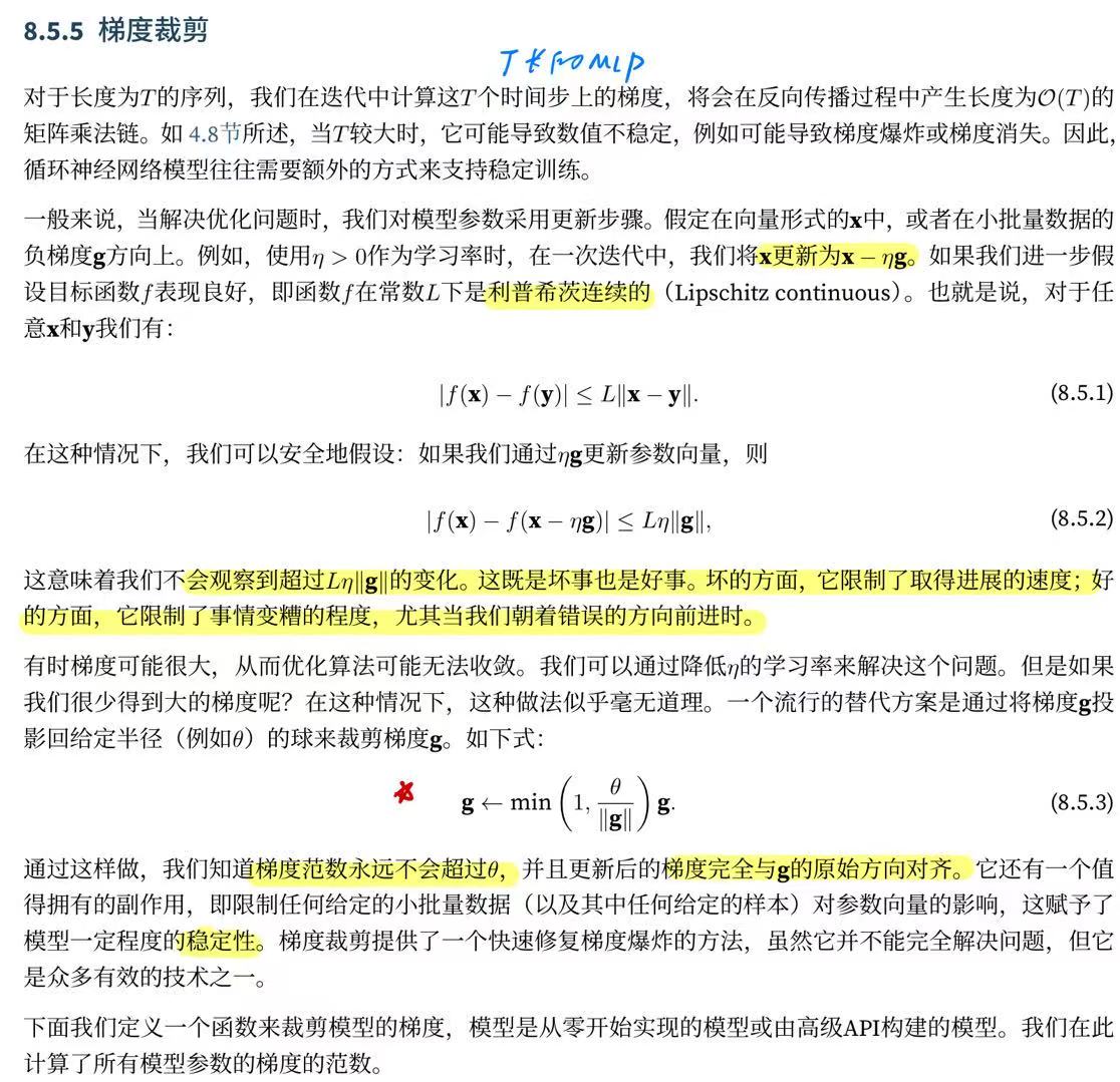 我们在更新模型参数之前裁剪梯度。 这样的操作的目的是,即使训练过程中某个点上发生了梯度爆炸,也能保证模型不会发散。