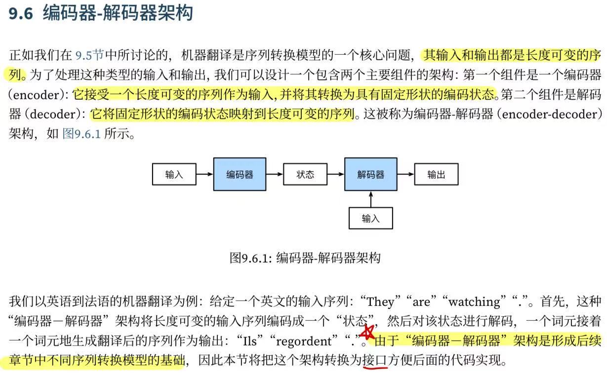 在下面的解码器接口中,我们新增一个init_state函数, 用于将编码器的输出(enc_outputs)转换为编码后的状态。 注意,此步骤可能需要额外的输入,例如:输入序列的有效长度, 这在 9.5.4节中进行了解释。 为了逐个地生成长度可变的词元序列, 解码器在每个时间步都会将输入 (例如:在前一时间步生成的词元)和编码后的状态 映射成当前时间步的输出词元。