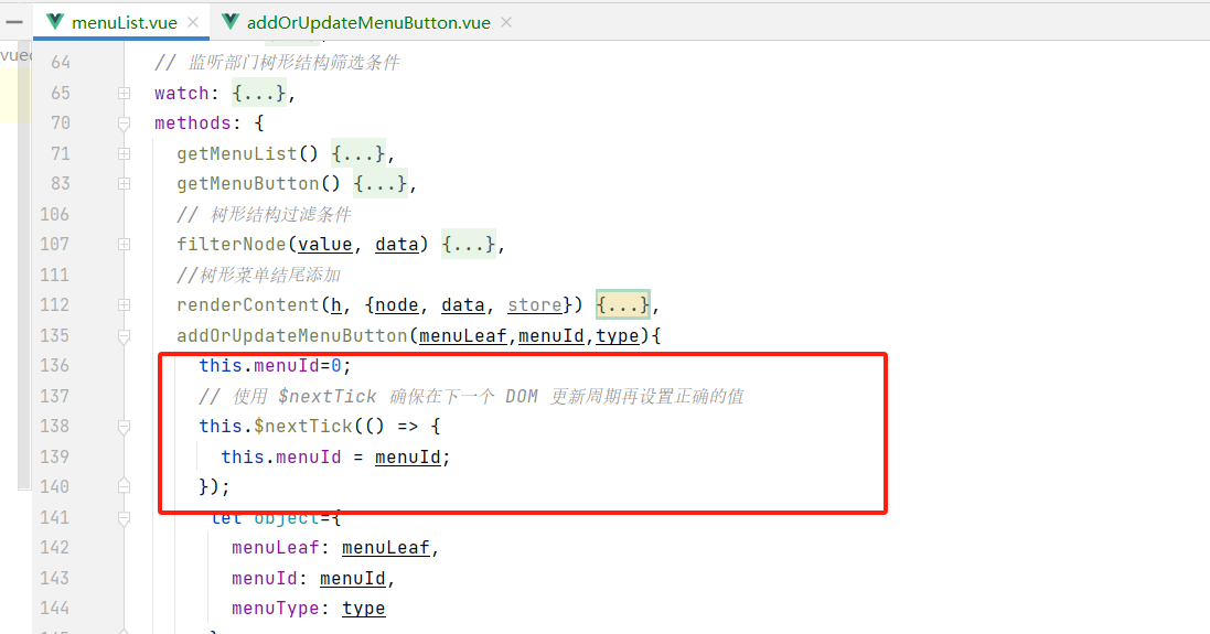 在每次传递值给子组件之前,先将menuId设置为一个不同的值,然后使$netxtTick,$nextTick 是在下一次“事件循环”执行回调,但它并不保证 DOM 已经挂载,只是保证当前数据更新队列处理完毕,两者缺一不可,在子组件中watch会执行两次一次0 一次是真正的数据,你在子组件中做一下校验就行了啊