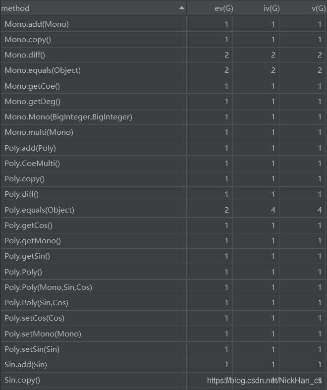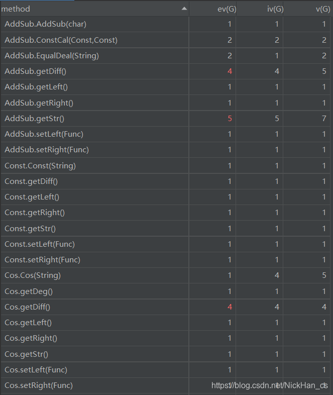 AddSub类的getDiff方法和getStr方法、Cos类的getDiff方法、Sin类的getDiff方法、Pow类的getDiff方法、Multi类的Multi方法、PowCal方法和getDiff方法为优化输出判断了多种特殊形式,用了较多的控制分支语句,导致基本复杂度高,非结构化程度高。Exp类的BrDeal方法,用于替换括号,方便提取括号中的表达式,但是在设计方法上不够好,导致基本复杂度高,程序较难理解。Exp类的FactorCheck方法和getItem方法耦合度较高,难于复用。Multi类的getStr方法为优化输出讨论的情况较多,导致圈复杂度高,给测试造成了一定难度。MainClass类的ValidCheck方法是用于检测WF的格式,所以用了较多的控制分支,导致基本复杂度、模块设计复杂度和圈复杂度较高。Exp类的用于解析字符串的getItem方法,由于本次作业的输入数据较为复杂,还出现了嵌套,所以只能使用递归的方法来解析输入的字符串,导致模块设计复杂度和圈复杂度较高。