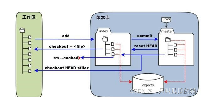 1、初始化完成后,开始项目之前需要了解几个概念:工作区、暂存区和版本库