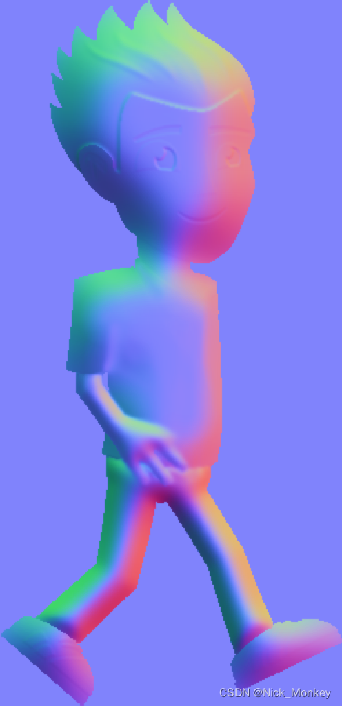 3)近景和男孩另外有一张法线图(法线图每个像素rgb表示的是该像素的三维坐标xyz,可有看出z轴是朝屏幕外的)