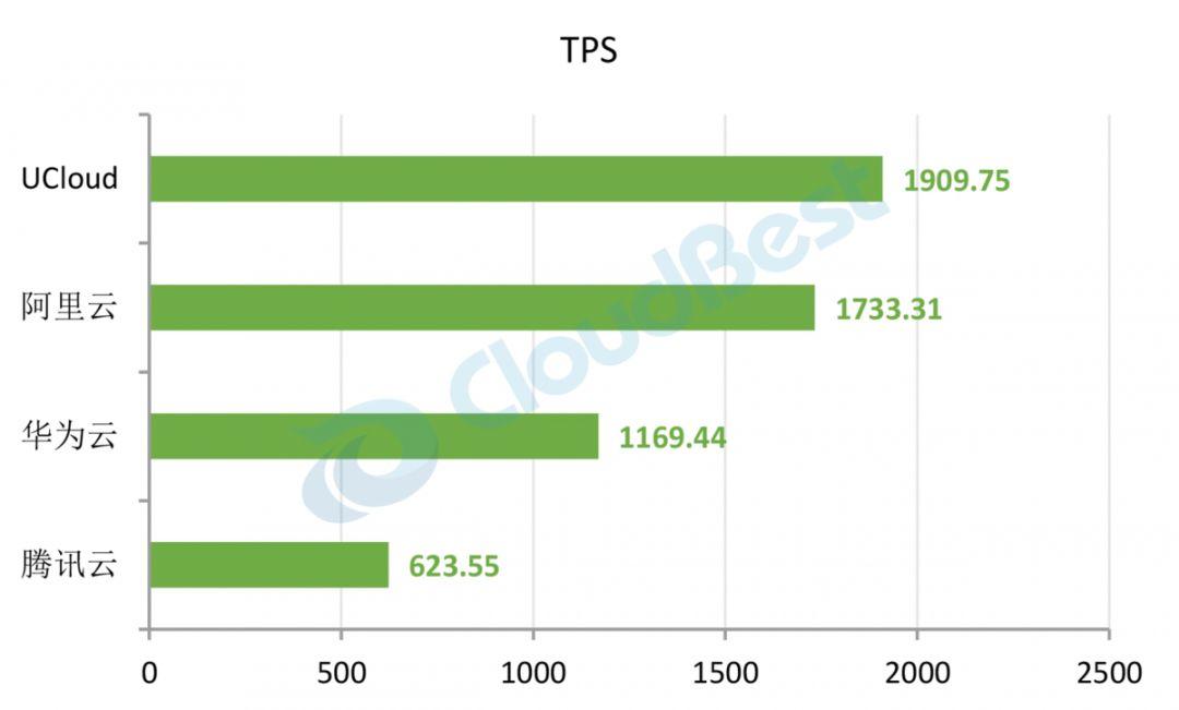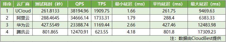 由上图我们可以看出,UCloud 和阿里云在每秒请求数和每秒事务数的指标上都表现不错,位居第一、第二位。而华为云和腾讯云在此项测试结果中,不占优势。