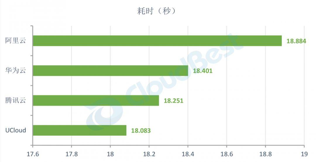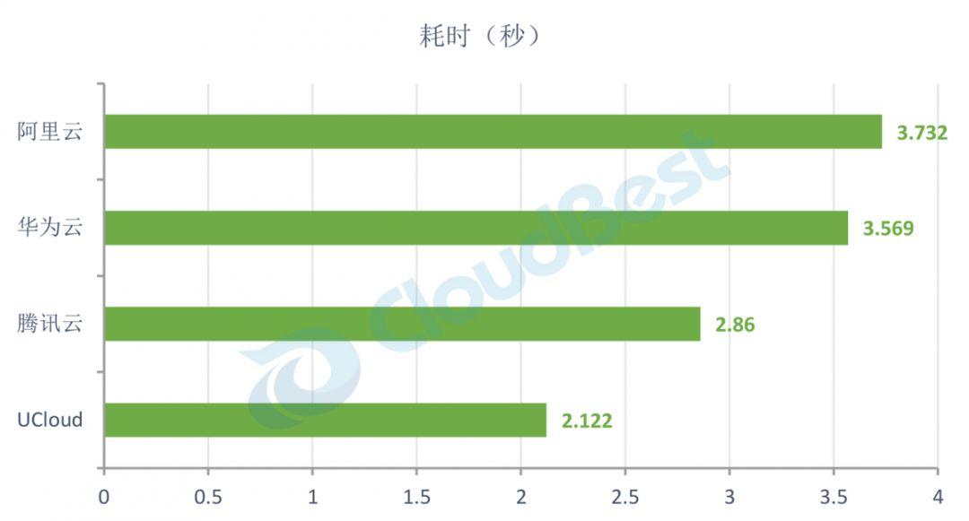 由上图我们可以看出,UCloud 耗时最短,位居第一。腾讯云比 UCloud 耗时长,但是却优于华为云和阿里云,因此位居第二位。华为云和阿里云耗时相近,分别位居第三、第四位。