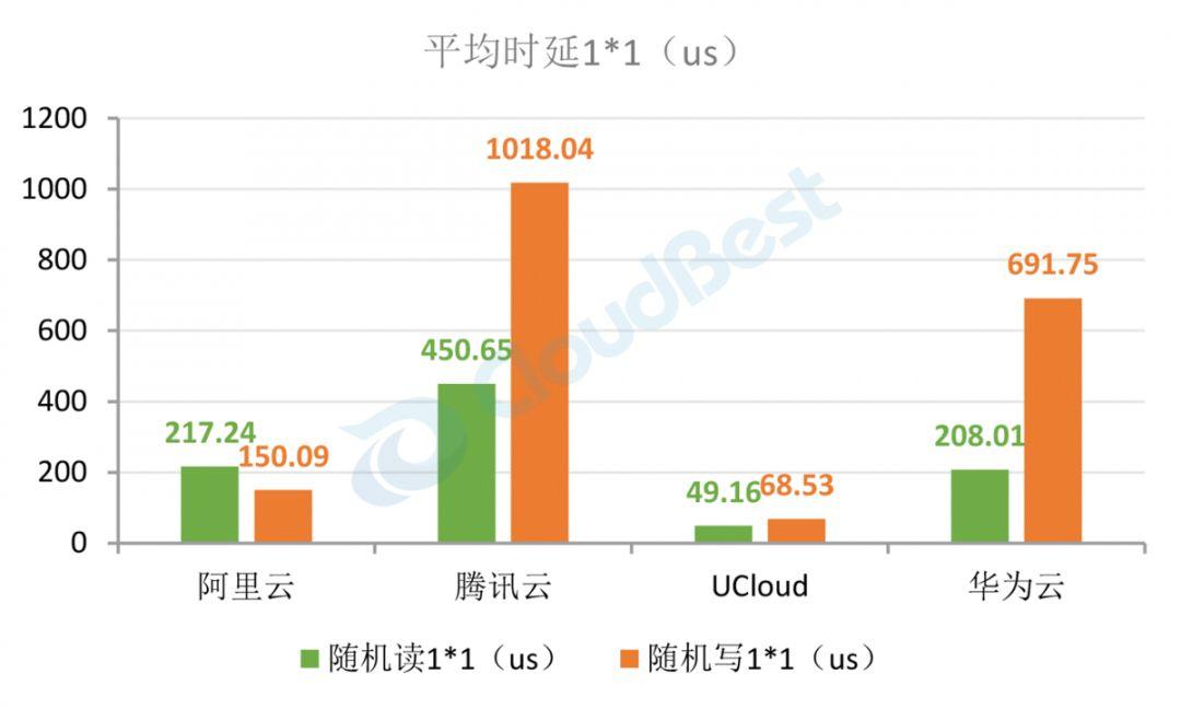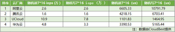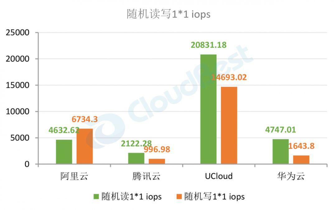 由队列深度分别为 1*1 和 7*16 的两组数据图表,我们可以看出,UCloud 在磁盘的随机读写测试中,表现都非常好,数据远超其他 3 家云厂商。
