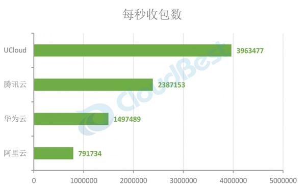 在内网的质量测试上,四家厂商差距较大。UCloud 每秒接收到小包的数量为接近 400 万个,位列第一位。阿里云每秒接收到小包的数量仅为80万左右,测试结果相对不理想,与 UCloud、腾讯云、华为云对比差距比较大。