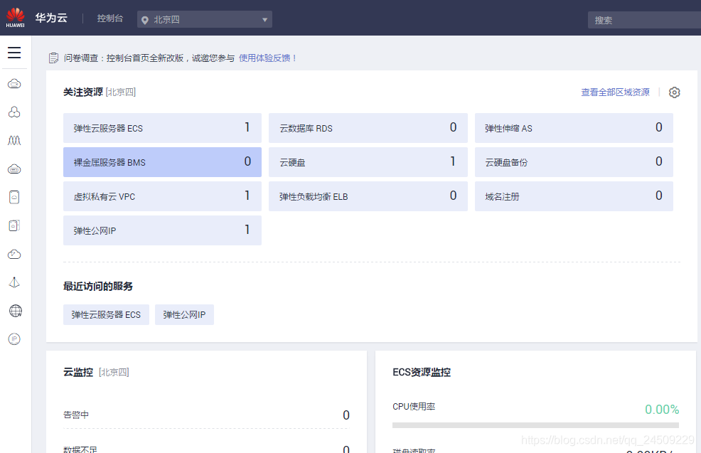 第一次买服务器服务,更是第一次买华为云的服务,看了一下跟别的云商家的区别,华为云很良心啊,配置(一核、2G内存、1M宽带、40G),以及华为云的控制界面也很简洁