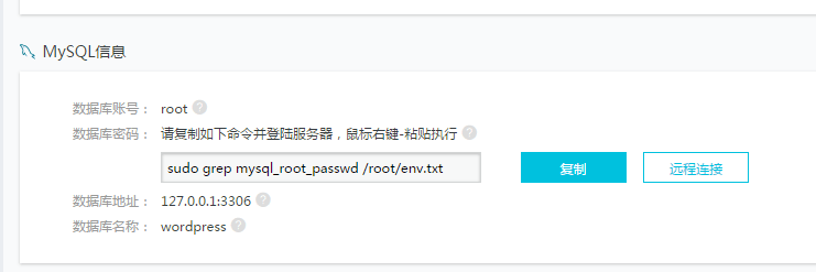 首先在应用详情里面 下方有MySQL信息 获取密码方法即是点击MySQL的远程连接,然后复制命令输入获取密码。一开始我以为这样就连接上数据库了,没想到其实入坑了,爬了好几个小时才出坑。因为轻量应用服务器的数据库本身是没有的,虽然服务器安装了mysql服务,但数据库要自己创建,一开始我以为是现成的可以使用,结果错得离谱。