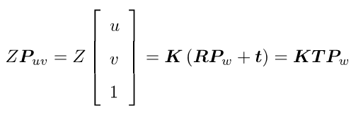 这个公式表示了世界坐标Pw到像素坐标Puv的转换。表示了从世界坐标(Pw)到相机坐标(通过外参R,t)再到像素坐标(通过K内方位元素)的转换。