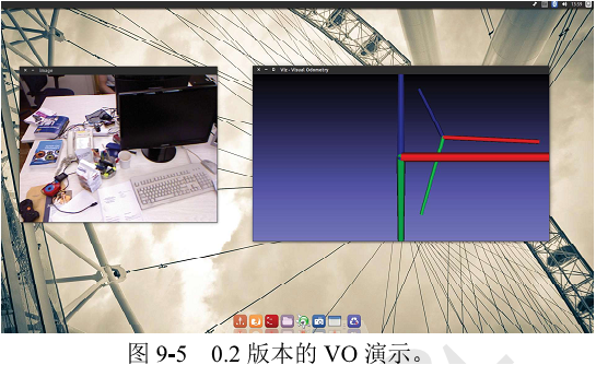 注意:这里使用的OpenCV3的viz模块显示估计位姿,请确保你安装的是OpenCV3,并且viz模块也编译安装了。准备tum数据集中的其中一个。简单起见,我推荐fr1_xyz那一个。请使用associate.py生成一个配对文件associate.txt。关于tum数据集格式我们已经在8.3节中介绍过了。在config/defualt.yaml中填写你的数据集所在路径,参照我的写法即可。然后用bin/run_vo config/default.yaml执行程序,就可以看到实时的演示了。