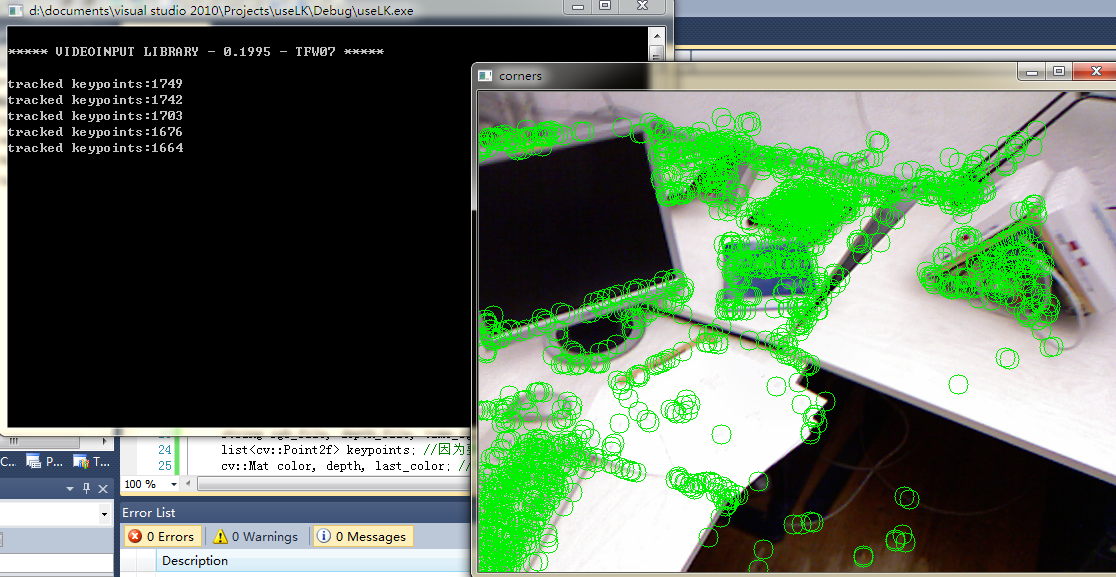 值得一提的是,由于各种原因,我们设计的上述VO算法,每一步都有可能失败。例如图片中不易提特征、特征点缺少深度值、误匹配、运动估计出错等等。因此,要设计一个鲁棒的VO,必须(最好是显式地)考虑到上述所有可能出错的地方——那自然会使程序变得复杂。我们在checkEstimatedPose中,根据内点(inlier)的数量以及运动的大小做一个简单的检测:认为内点不可太少,而运动不可能过大。当然,读者也可以思考其他检测问题的手段,尝试一下效果。