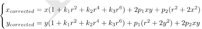 进行径向畸变纠正和切向畸变纠正。其中k1,k2,k3为径向畸变参数,而p1,p2为切向畸变参数。