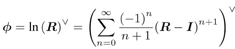 回忆前一讲内容,它和罗德里格斯公式如出一辙。这表明,so(3)实际上就是由旋转向量组成的空间,而指数映射即罗德里格斯公式。通过它们我们把so(3)中任意一个向量对应到了一个位于SO(3)中的旋转矩阵。反之,如果定义对数映射,我们也能把SO(3)中的元素对应到so(3)中: