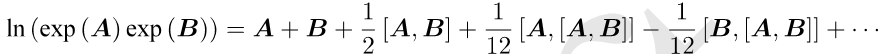 首先是,两个李群中的数进行乘积时,对应的李代数是怎么样的变化,是不是指数变化呢?但是注意,李群里的数是矩阵,不是常数,所以不满足ln(exp(A+B))=A+B,因为A,B是矩阵,不是常数,那么是怎么的对应关系呢?