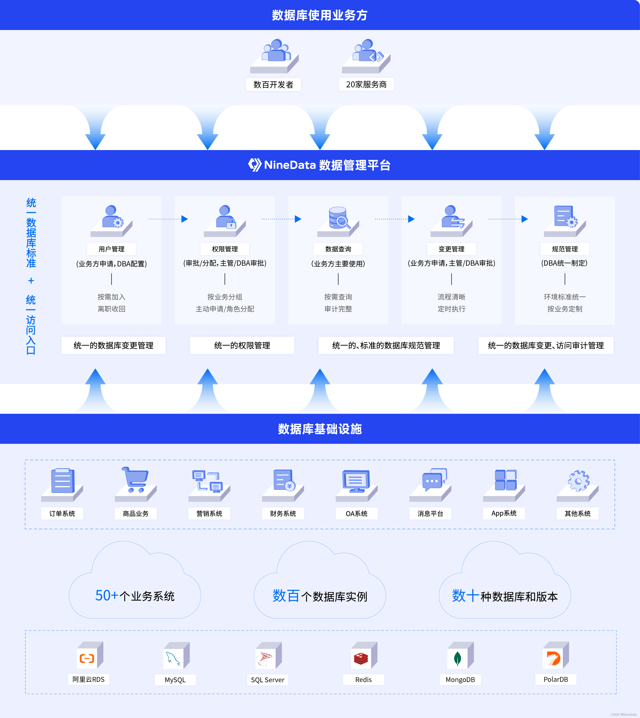 NineData 为该企业提供了一套全面的数据库管理服务,包括细粒度权限管控、审计日志、SQL 开发规范、审批流程、多平台多数据库类型支持等功能,帮助他们实现了更加高效和安全的数据库管理。