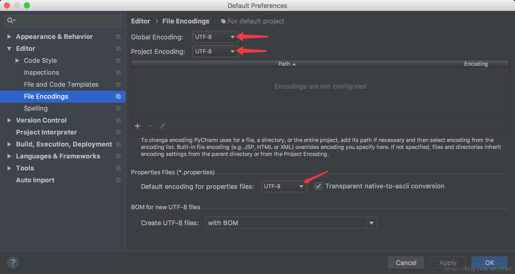 依次是Pycharm->Preferences->Editor->File Encoding,看到有Encoding的地方都改为UTF-8。