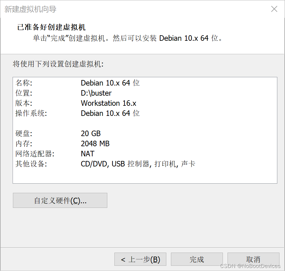6、点击自定义硬件,你可以自己配置一些硬件。我一般只把处理器改成2*2的,其他默认。改完后点击完成,本部分结束。