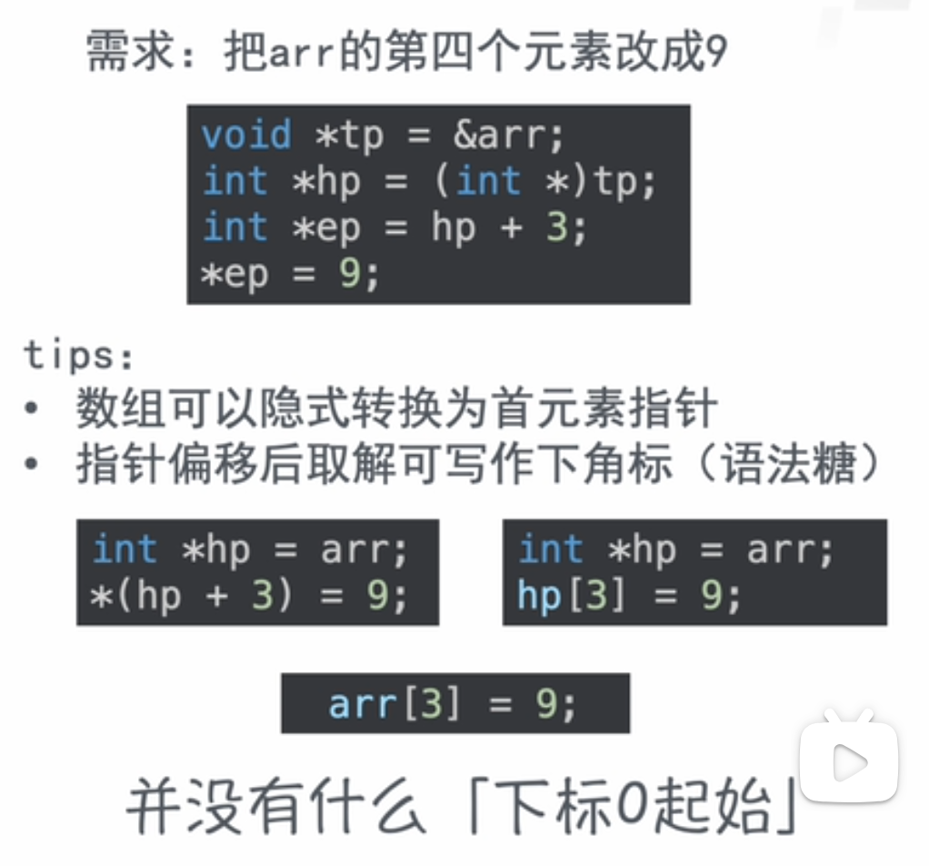 数组是语法糖,数组的下标符号可以理解成指针偏移再解指针的操作,所以下标从零开始这种说法是合理的,因为首地址是不需要偏移的,并且数组可以隐式转换为首元素指针。当内存变量的类型为数组时,多维数组就产生了。