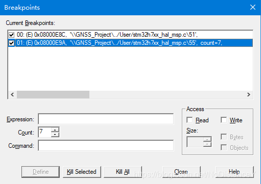 | 访问断点 | 不受影响 | 语句中有一种内存访问模式被声明(Read、Write或 READWRITE)的点断。 内存访问断点的表达式exp必须能解析为内存地址和内存类型(Cortex-M有个特例,见测试4)。 详细使用限制见[1] |