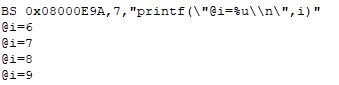 >>BS WRITE *((unsigned int*)0x24000000)==6,1,"printf(\"@i=%u\\n\",i)\r\n_break_=1"