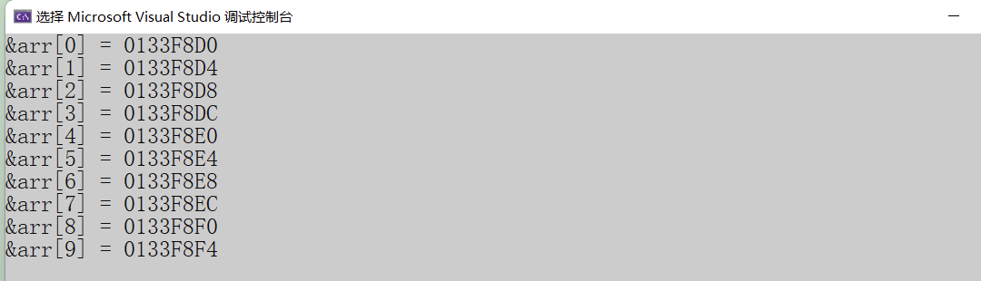 数组随着下标的增长,地址是由小到大变化的,并且我们发现每两个相邻的元素之间相差4(因为一个整型是4个字节)。所以得出结论:数组在内存中是连续存放的。