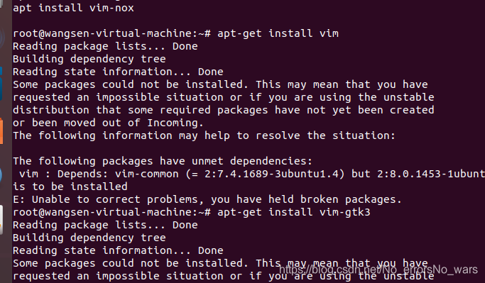 vim安装时报错,“Depends:vim-common (=2:7.4.1689-3ubuntu1.4) but 2:8.0.1453-1ubuntu1.1 is to be installed”