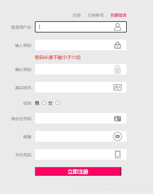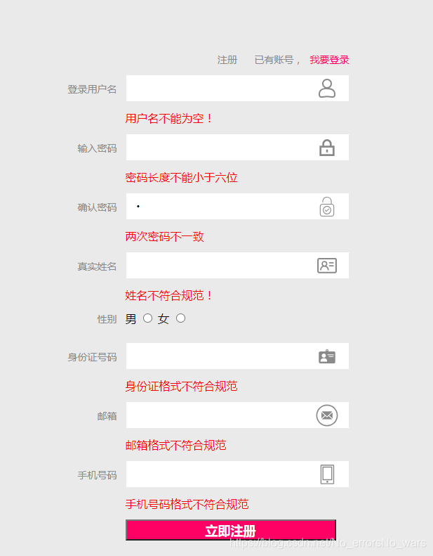 点击注册按钮时,检核所有数据是否合格,合格则打包发送给服务器(未完成的功能),不合格则输出警告语句