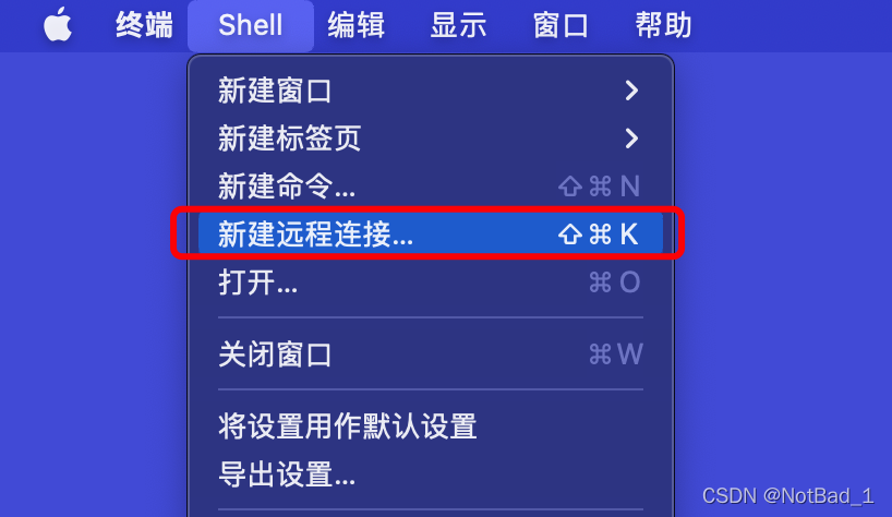 1. 打开终端,并在shell菜单中选择"新建远程连接"。
