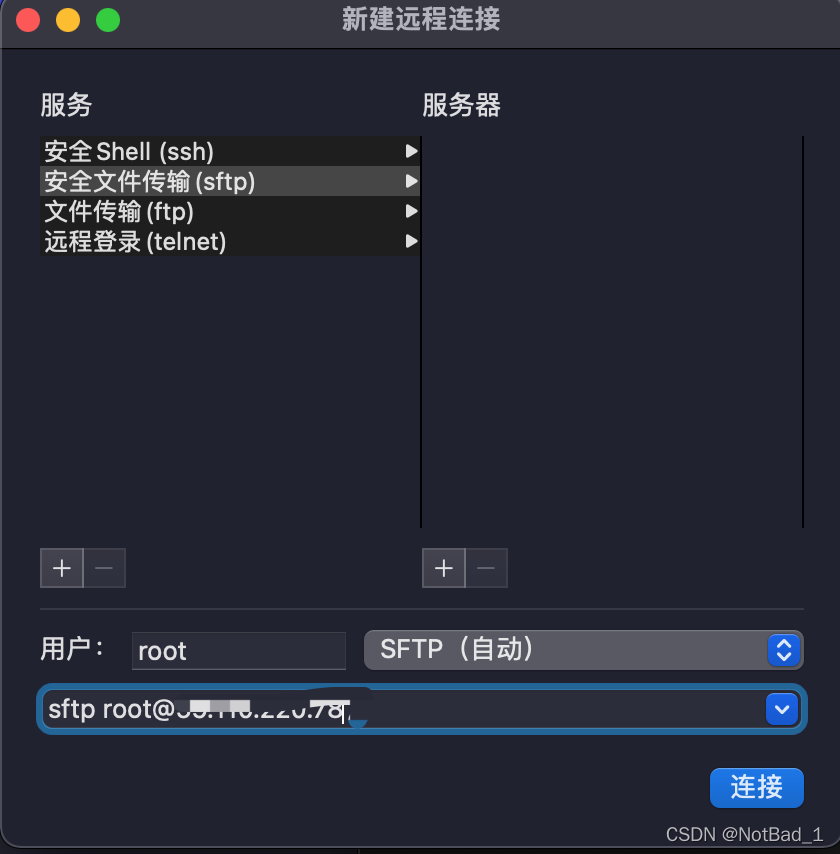 2. 在弹出的对话框中,选择sftp,在最下面的输入框中填入云服务器的公网地址和用户名(root),最后点击“连接”按钮。
