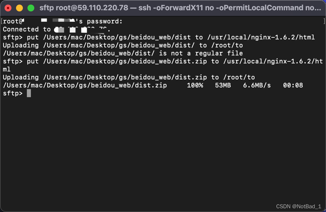 这篇博客介绍了如何通过终端使用SFTP连接到云服务器,并利用'put'命令将本地文件上传到服务器,详细步骤包括配置服务器公网地址和用户名,以及文件的上传操作。