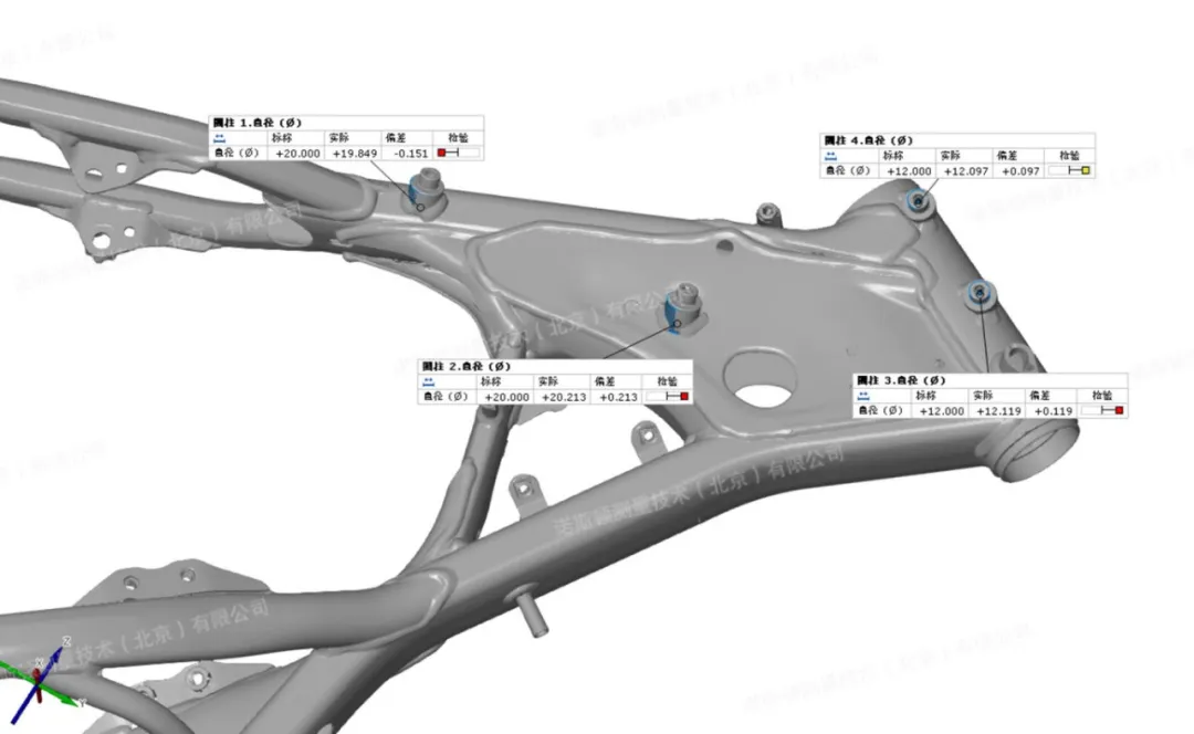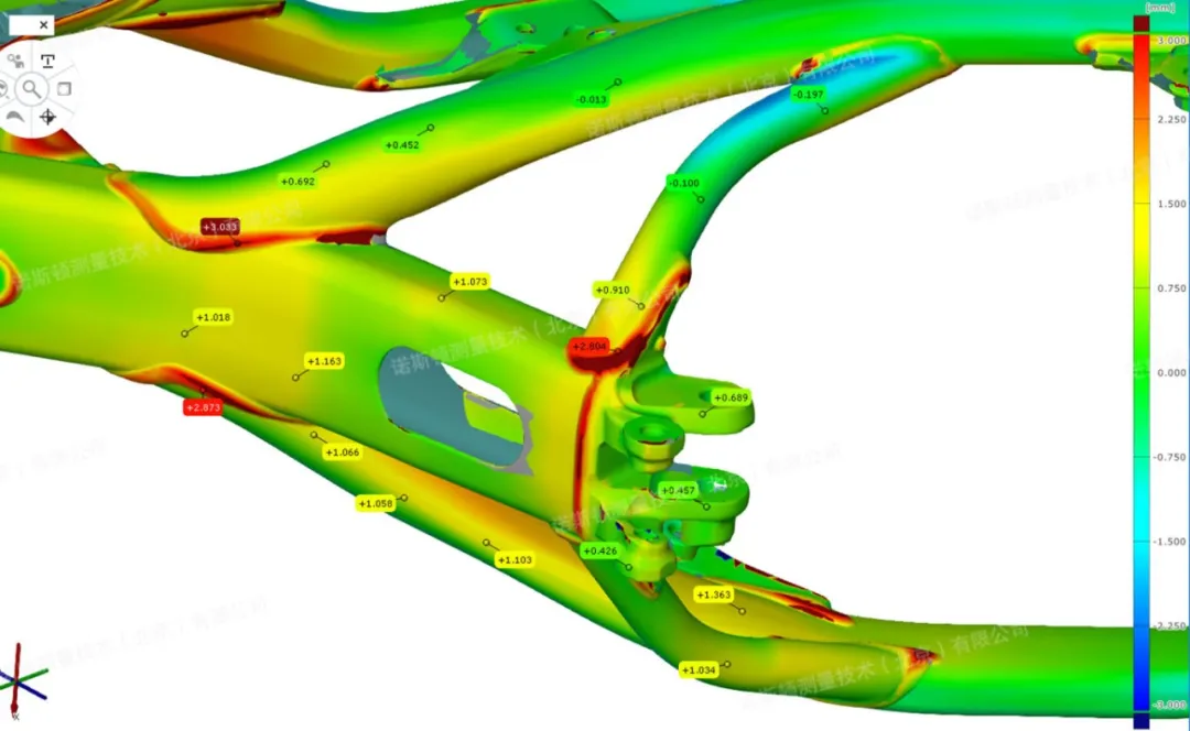 扫描获取的数据可直接导入专业的检测软件,与原始CAD模型进行自动对齐与比对,生成直观的彩色偏差色谱图。对于发动机缸体的孔径公差、车架的尺寸精度、齿轮的齿形偏差等关键参数,系统能精准识别细微超差,明确标注超差区域的位置与数值,帮助质检人员快速判定合格性。