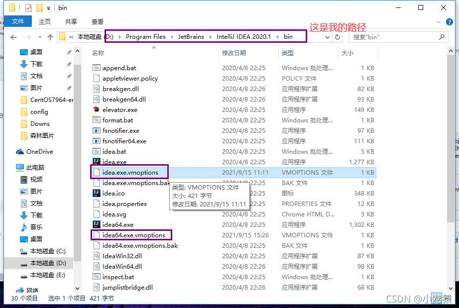 找到idea的配置文件,idea.exe.vmoptions和idea64.exe.vmoptions这两个文件,路径在IntelliJ IDEA本地安装目录中bin文件夹下。